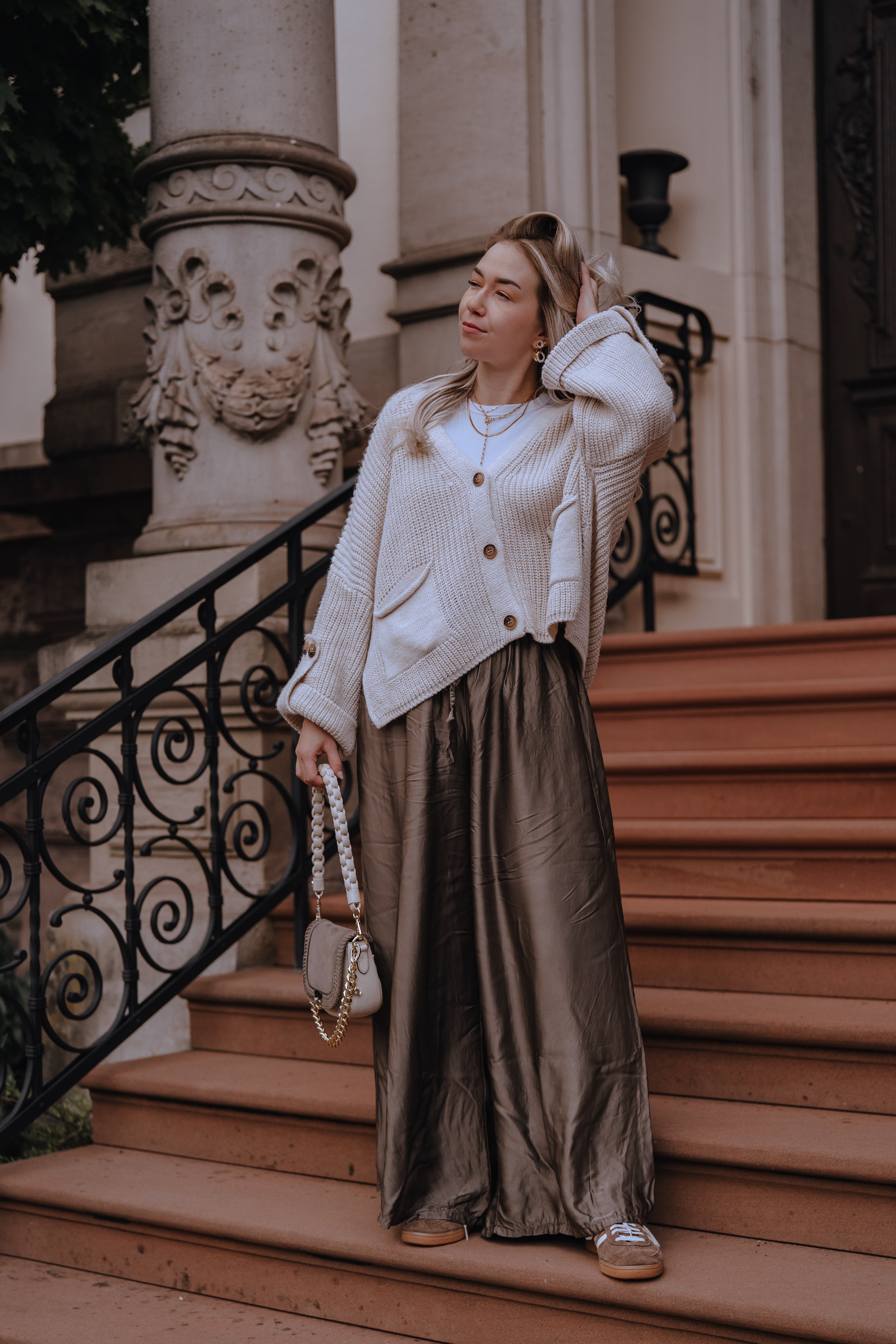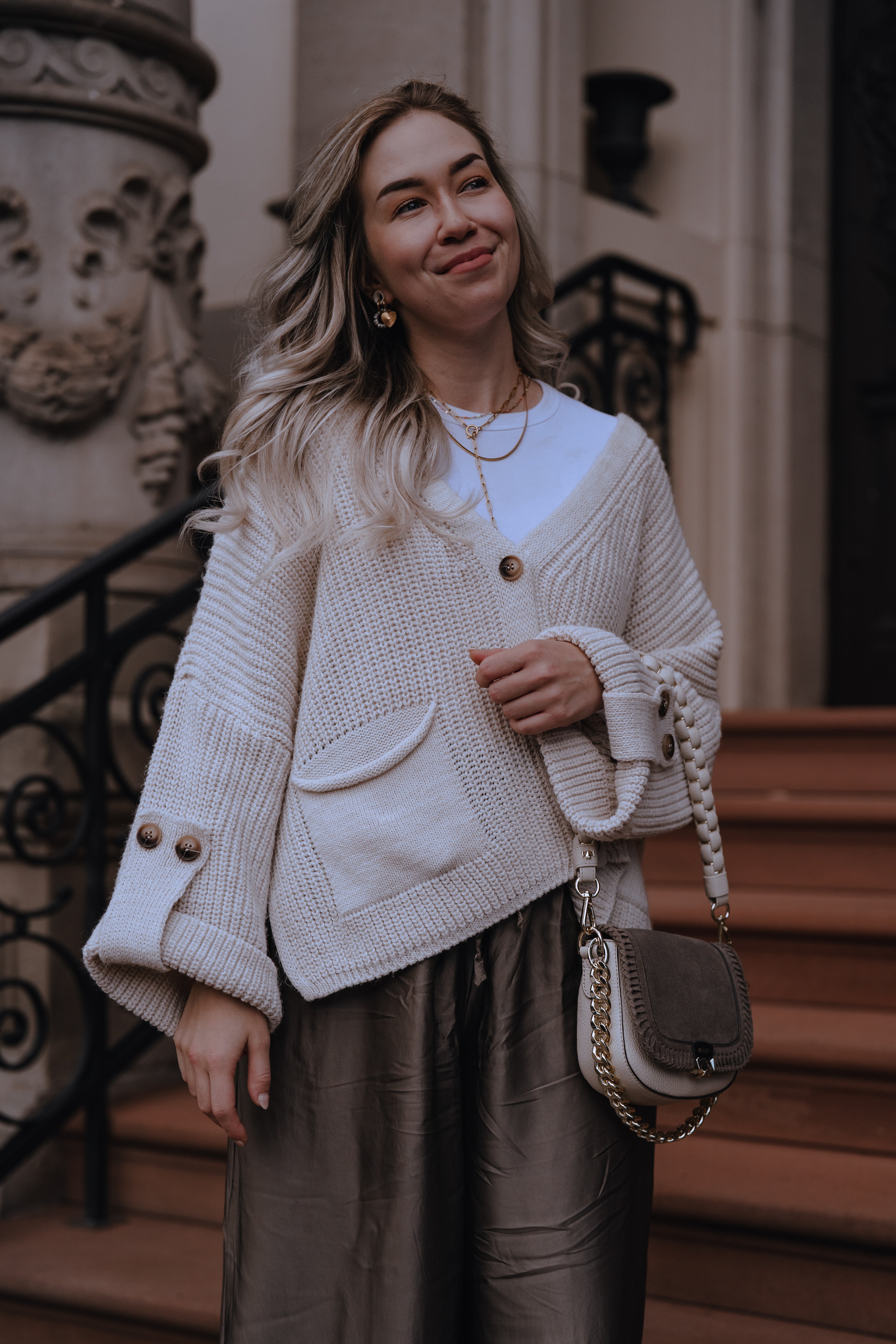 Strickjacke, goldene Knöpfe, Beige-Camel