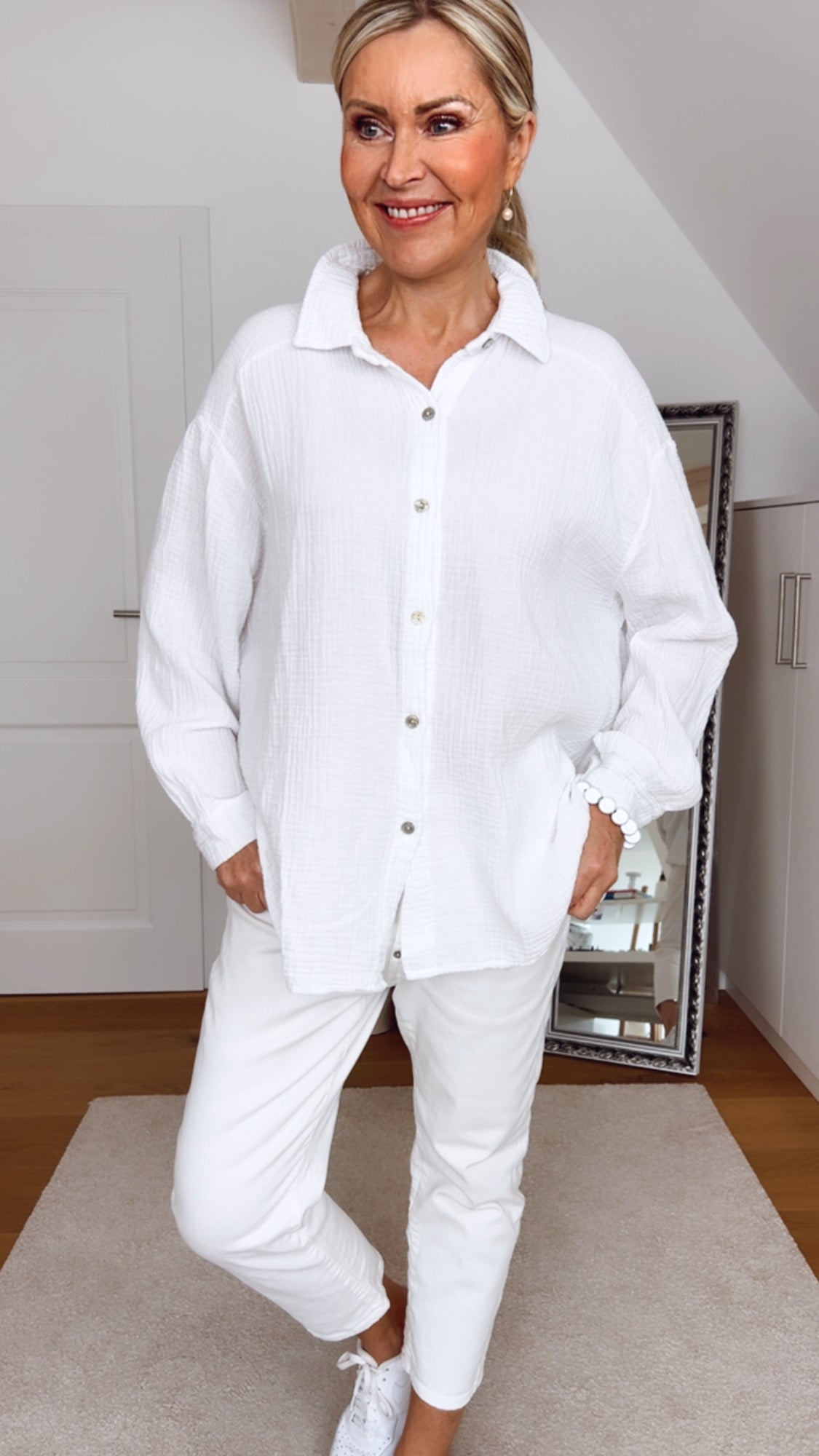 Musselin Bluse, long oversize, Weiß