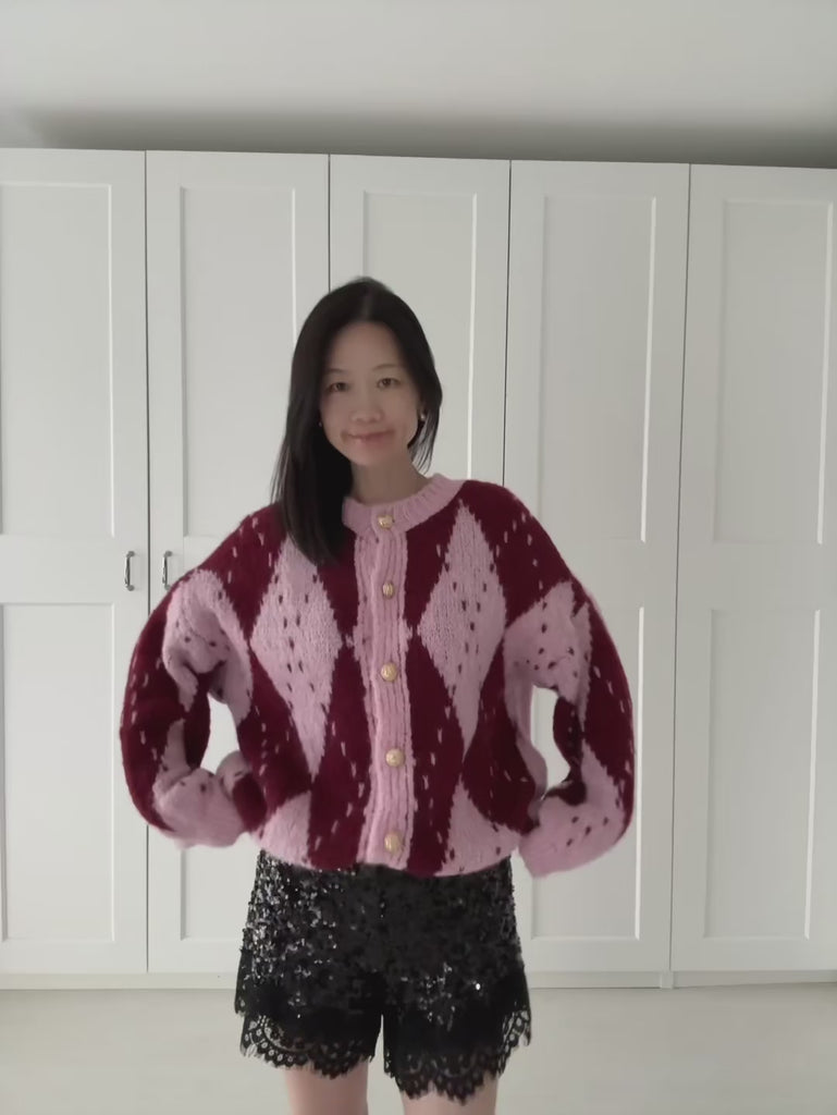 Style: Strickjacke, mit Argyle-Muster, Rundhalsausschnitt, mit goldenen Knöpfen, ohne Taschen
