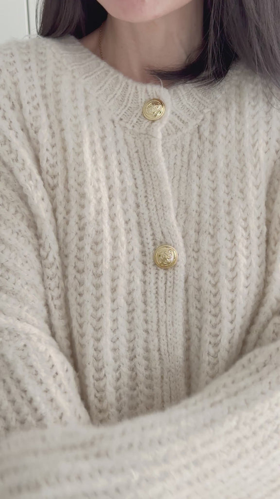Style: Strickjacke, Grobstrick, aufgeraut, mit goldenen Knöpfen, Laternenärmeln, ohne Taschen